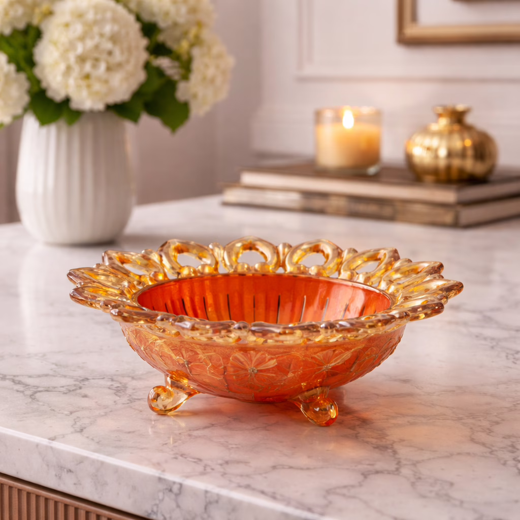 Misa iryzowana „Hearts and Flowers”. Dekoracyjna misa szklana o iryzowanym wykończeniu w kolorze marigold (złoto-pomarańczowy połysk). Brzeg zdobiony ażurowym wzorem przypominającym serduszka, a na spodzie widoczny jest bogaty ornament kwiatowy.