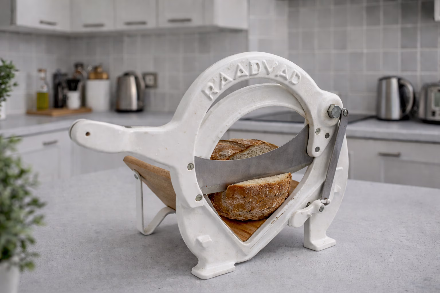 Klasyczna, ręczną krajalnica do chleba marki Raadvad, wykonana w całości w tradycyjnej technologii, z ciężkiego żeliwa lakierowanego na czarno oraz z drewnianą prowadnicą pieczywa. Jest to stołowy model z łukową ramą i stalowym ostrzem prowadzonym w mechanizmie dźwigniowym, umożliwiającym równomierne krojenie chleba bez użycia prądu. Wymiary korpusu krajalnicy wynoszą około 20 cm długości, około 24 cm szerokości i około 24 cm wysokości, przy czym należy zaznaczyć, że drewniany uchwyt dźwigni tnącej wystaje poza obrys urządzenia i zwiększa jego całkowitą długość podczas użytkowania. Stan zachowania oceniam jako bardzo dobry, z niewielkimi naturalnymi śladami użytkowania adekwatnymi do wieku przedmiotu; żeliwna rama zachowana jest w świetnym stanie, ostrze kompletne, proste i sprawne, a elementy drewniane noszą delikatne ślady eksploatacji oraz patynę, bez ingerencji w oryginalną formę. Mechanizm pracuje płynnie, bez luzów, krajalnica jest kompletna i gotowa do dalszego użytkowania lub ekspozycji. Na podstawie stylistyki, technologii wykonania oraz oznaczeń producenta przedmiot można przybliżenie datować na drugą połowę XX wieku. Idealna propozycja zarówno do rustykalnej lub nowoczesnej kuchni jako sprawny sprzęt użytkowy, jak i do kolekcji skandynawskiego wzornictwa użytkowego. Zdjęcia przedstawiają rzeczywisty produkt. Ostatnie zdjęcie to przykładowa aranżacja krajalnicy we współczesnej kuchni.