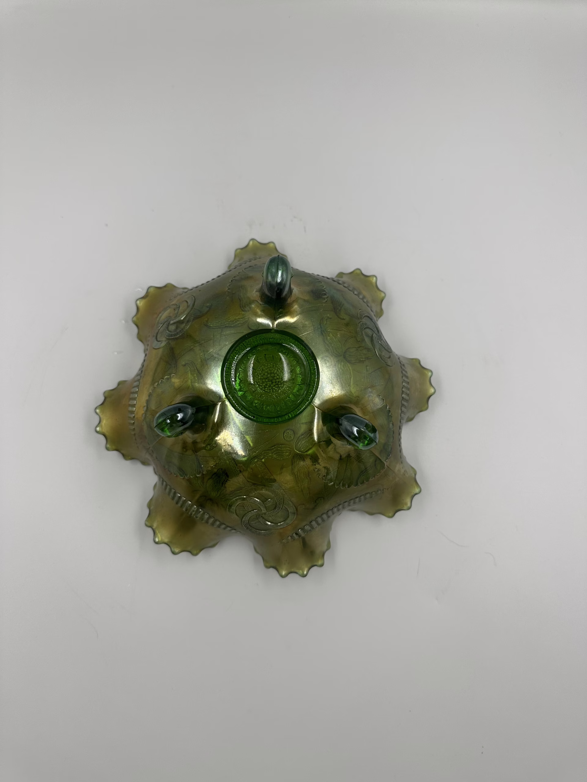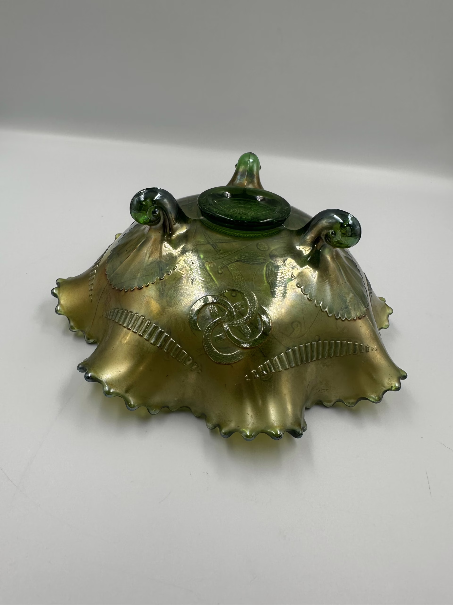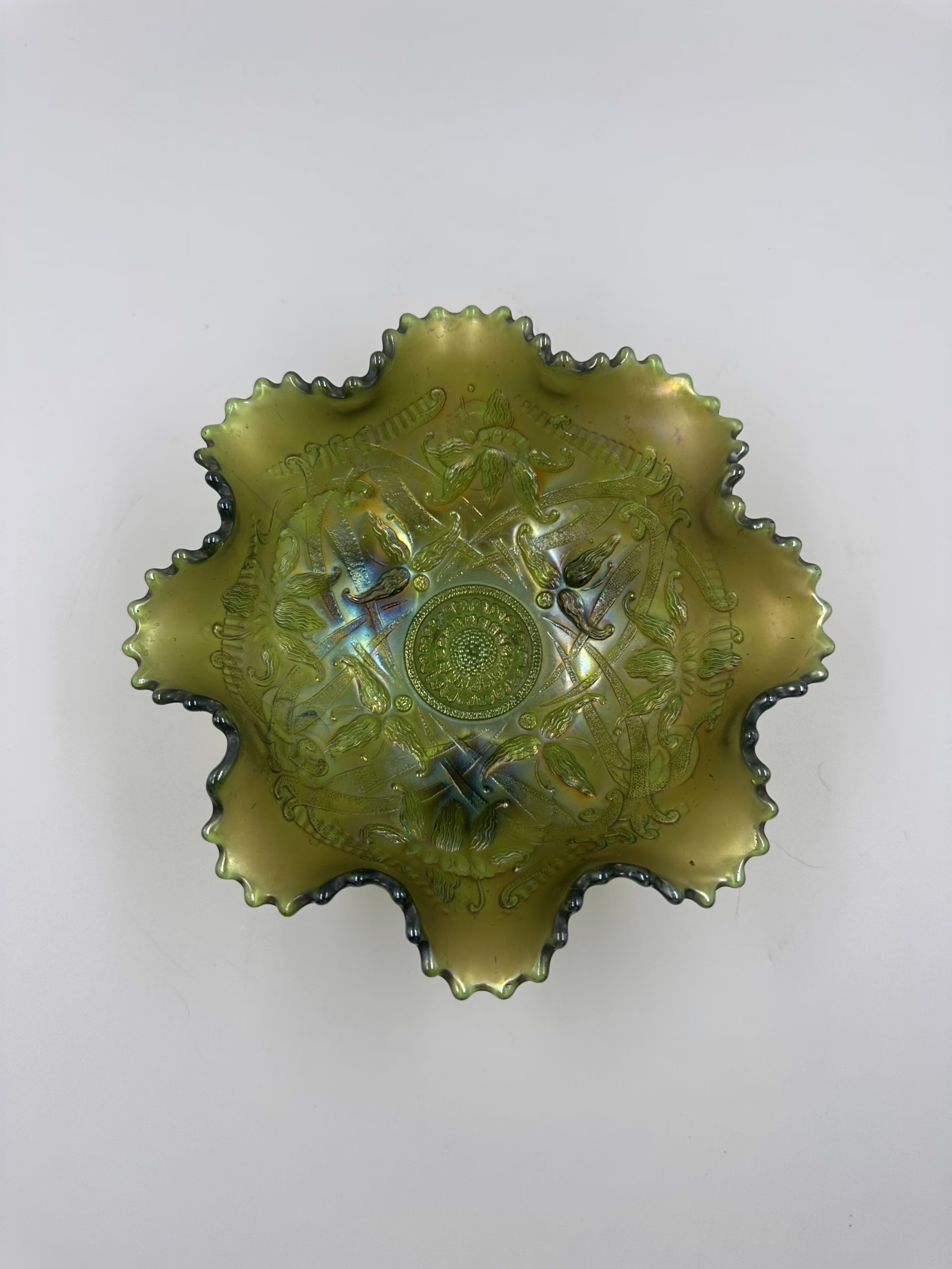 Oryginalna misa ze szkła iryzowanego typu carnival glass, wykonaną na początku XX wieku, w okresie secesji. Przedmiot wyróżnia się intensywnym, metalicznym połyskiem w odcieniu oliwkowo-zielonym, bogatym tłoczonym ornamentem roślinnym we wnętrzu oraz efektownym, głęboko falowanym rantem o ręcznie wykończonej krawędzi. Misa osadzona jest na trzech masywnych, spiralnie formowanych stopkach, co nadaje całości rzeźbiarskiego charakteru i stabilności.