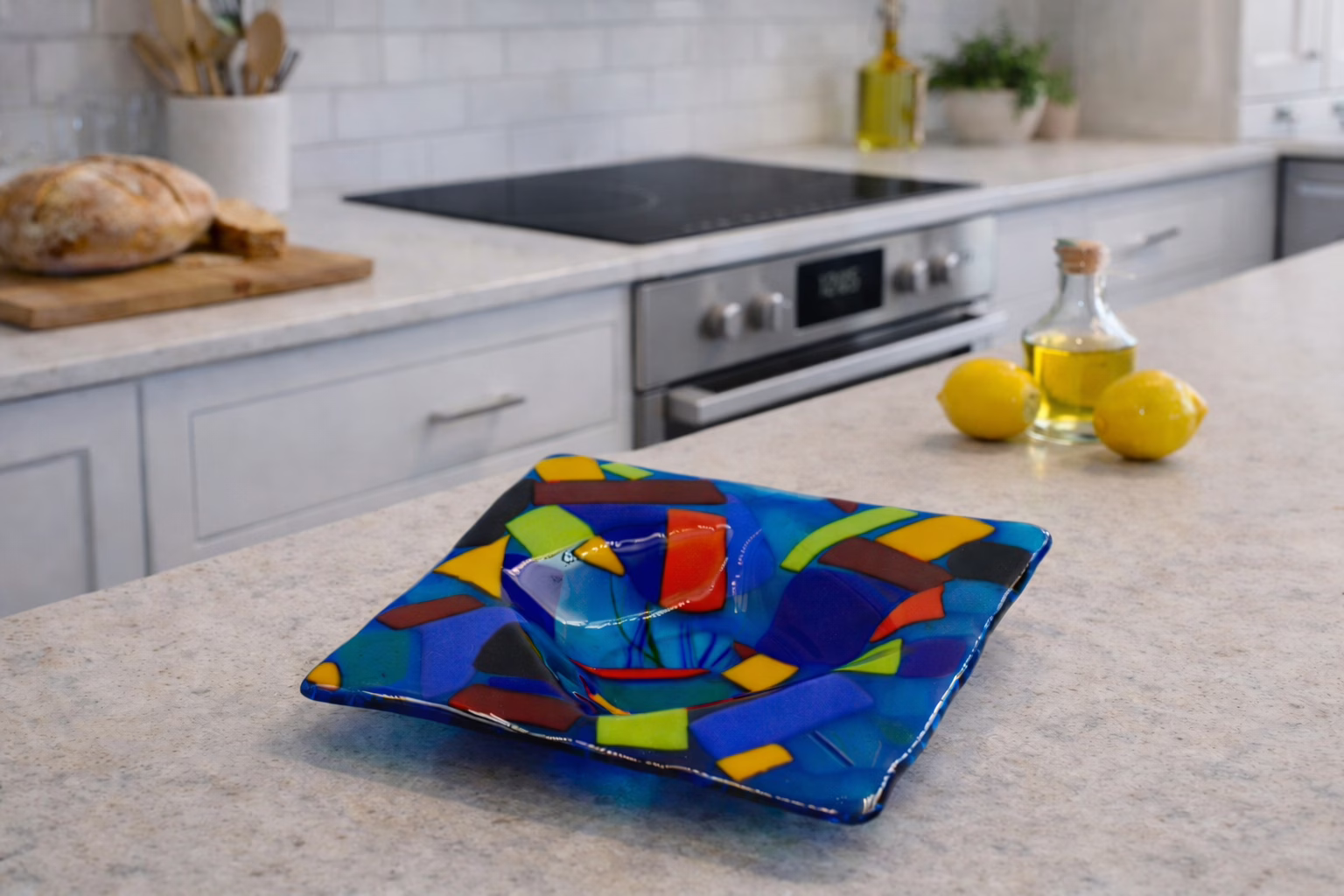 Forma naczynia jest kwadratowa z lekko podniesionymi narożnikami oraz zagłębieniem pośrodku, co nadaje mu zarówno funkcję dekoracyjną, jak i użytkową. Intensywna kolorystyka – dominujący kobaltowy błękit z elementami czerwieni, żółci, zieleni i czerni – tworzy efekt przypominający mozaikę lub abstrakcyjną kompozycję modernistyczną, charakterystyczną dla współczesnego szkła dekoracyjnego.