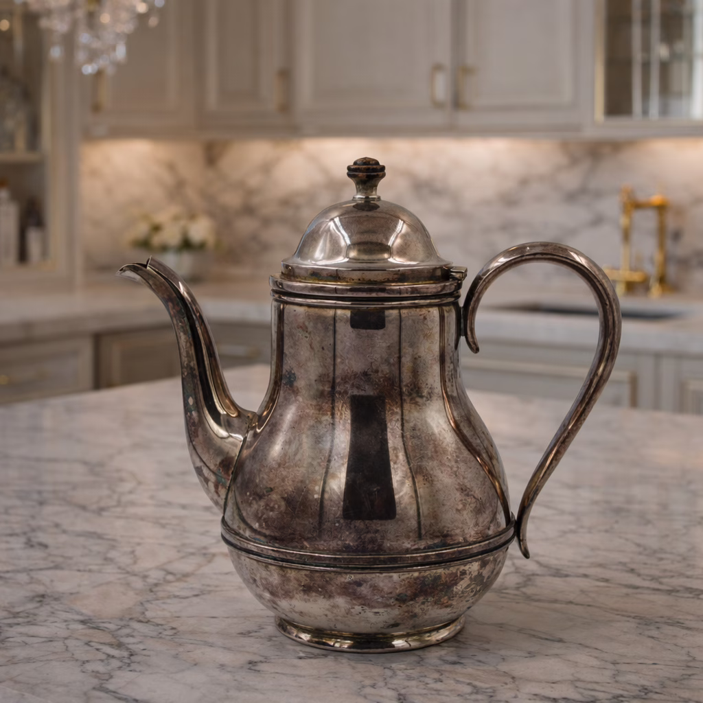 Elegancki posrebrzany dzbanek/imbryk o klasycznym, zaokrąglonym kształcie, oznaczony na spodzie „DENMARK” i numerem 31638. Przybliżone datowanie: początek–połowa XX wieku. Wysokość 23 cm, waga 479 g. Wykonany z metalu ze srebrzonym wykończeniem; powierzchnia nosi naturalną patynę oraz ślady użytkowania (przebarwienia i drobne zarysowania), co dodaje mu autentycznego, vintage charakteru. Zawias pokrywki jest w dobrym stanie, bez luzów. Dzbanek jest szczelny. Uchwyt pokrywki wykonany z drewna. Idealny jako dekoracja, do kolekcji lub do renowacji — po polerowaniu odzyska połysk. Zdjęcia przedstawiają sprzedawany egzemplarz. Pierwsze zdjęcie to przykładowa wizualizacja dzbanka we współczesnym wnętrzu.