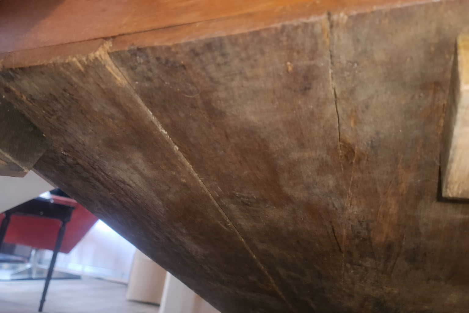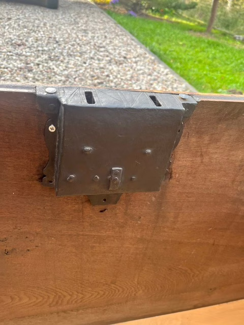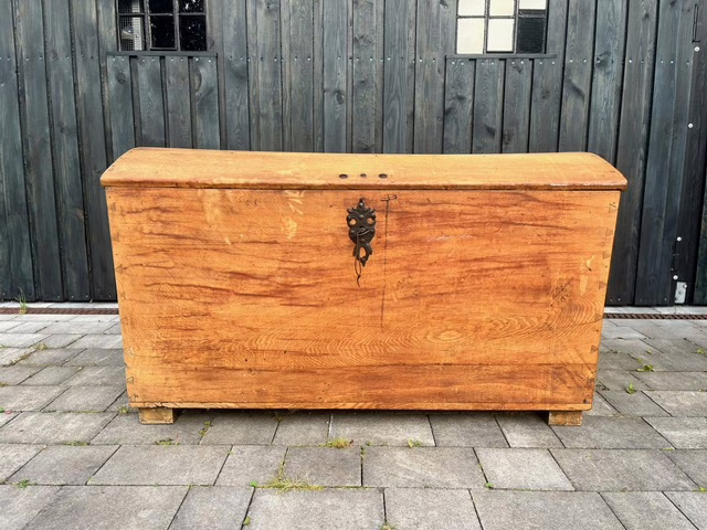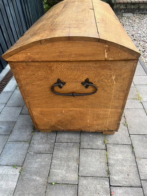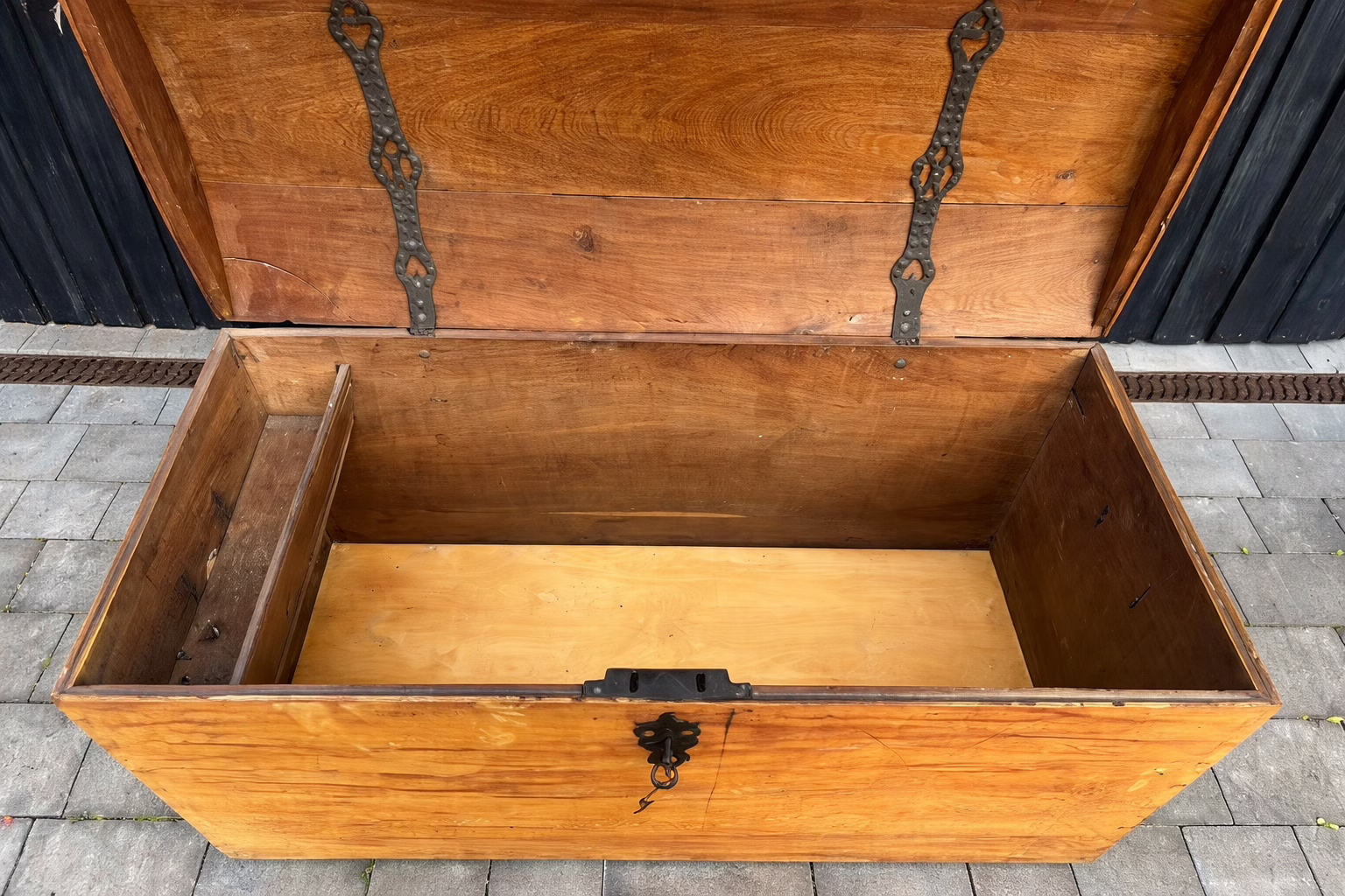 Stara skrzynia posagowa. Duża, oryginalna skrzynia drewniana o charakterze użytkowo-dekoracyjnym, wykonana z litego, twardego drewna i wyposażona w ręcznie kute okucia żelazne. Forma skrzyni, z charakterystyczną lekko łukową pokrywą oraz długimi zawiasami pasowymi, wskazuje na produkcję przełomu XIX i początku XX wieku. Mebel zachował autentyczny charakter – widoczne są ślady ręcznej obróbki, naturalna patyna drewna oraz oryginalne elementy metalowe.