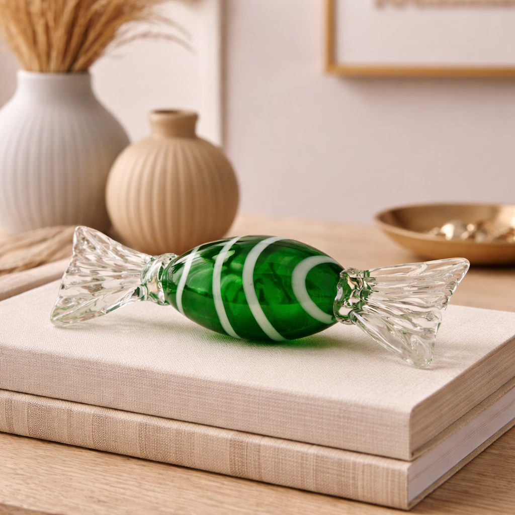 Dekoracyjna figurka ze szkła artystycznego w formie cukierka, wykonana z barwionego szkła w głębokim zielonym kolorze, ozdobiona spiralnymi, białymi pasami. Charakterystyczne, ręcznie formowane końcówki naśladujące skręcony papierek nadają całości lekkości i wyjątkowego, rzemieślniczego charakteru.