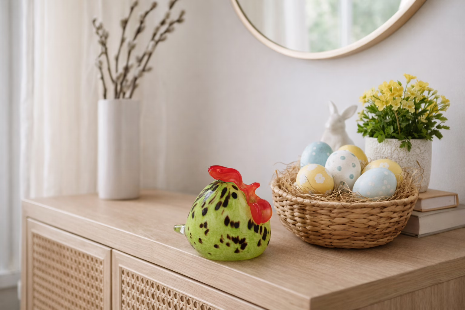 Niewielki rozmiar oraz dekoracyjny charakter sprawiają, że figurka dobrze sprawdzi się jako ozdoba półki, komody lub element sezonowej dekoracji – szczególnie w aranżacjach wielkanocnych.