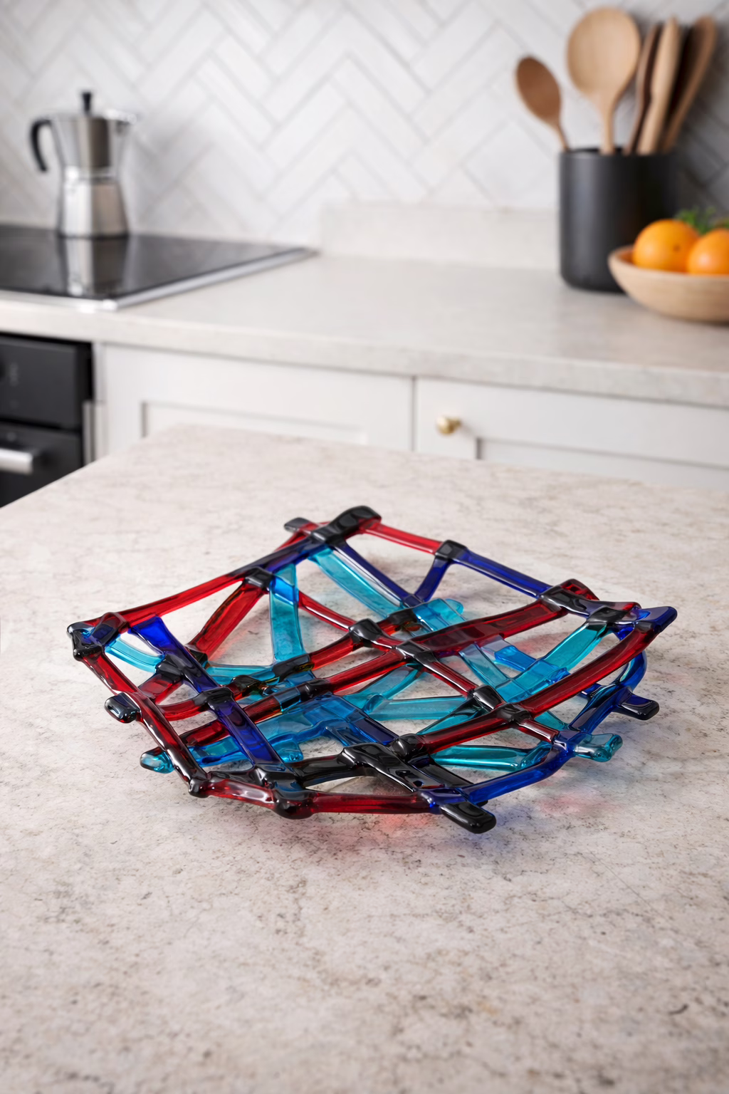 Dekoracyjny półmisek lub podstawka pod gorące naczynia wykonana ze szkła artystycznego w technice fusingu. Ręcznie formowana, ażurowa konstrukcja z kolorowych elementów szklanych w odcieniach czerwieni, kobaltu, turkusu i czerni. Forma łączy funkcję użytkową z dekoracyjną, idealna pod czajnik, garnek lub jako nowoczesna ozdoba kuchni lub jadalni. Widoczne cechy pracy ręcznej i indywidualnego formowania szkła. Przybliżone datowanie: lata 70.–90. XX wieku. Prawdopodobne miejsce produkcji: Skandynawia lub Europa Zachodnia, pracownia szkła artystycznego. Stan zachowania dobry, bez pęknięć, drobne ślady użytkowania adekwatne do wieku przedmiotu. Przedmiot kolekcjonerski i użytkowy w stylistyce vintage / modern. Ostatnie zdjęcie przedstawia przykładową wizualizację przedmiotu we współczesnym wnętrzu.